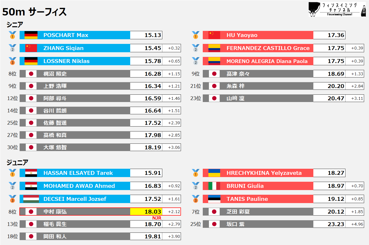 ワールドカップ_ゴールデンファイナル_サーフィス_50m_結果(フィンスイミングチャンネル)