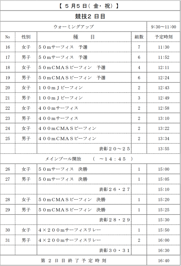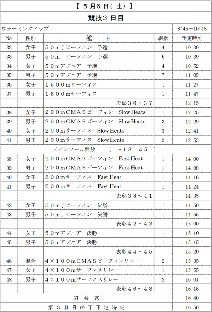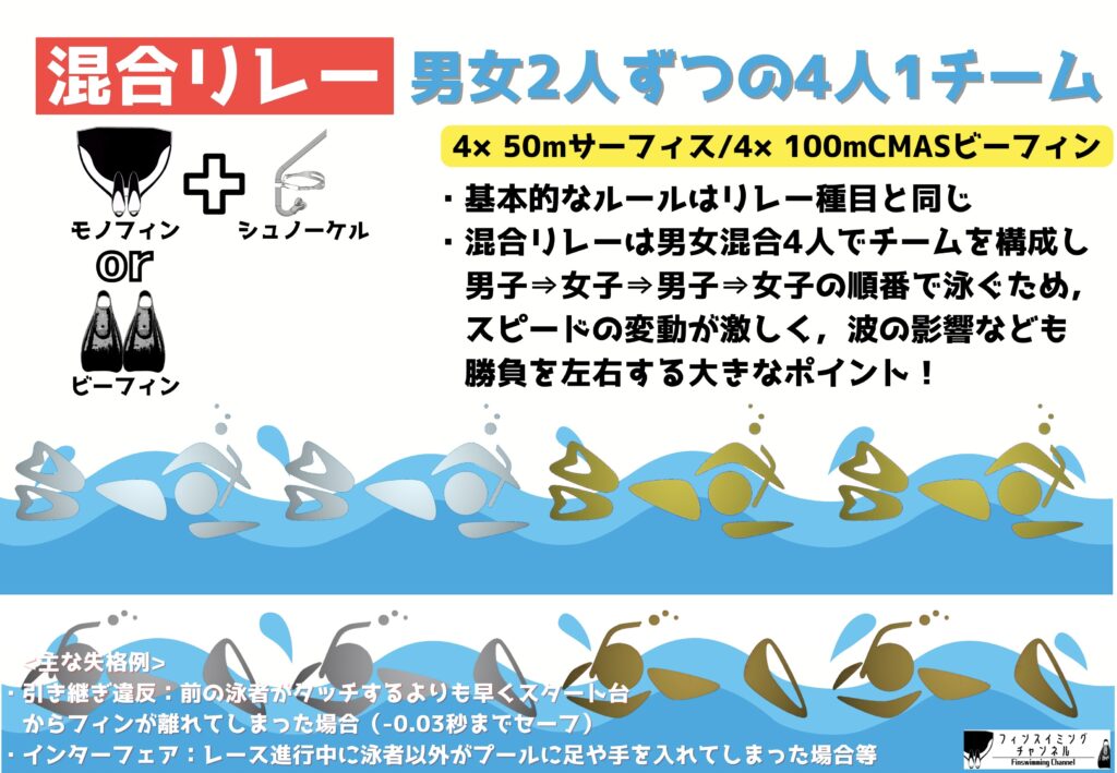 - 混合4×50mサーフィスリレーおよび混合4×100mビーフィンリレーの代表選考は,50mサーフィスおよび100mCMASビーフィンの男女それぞれ上位2名の合計タイムが派遣標準記録を突破